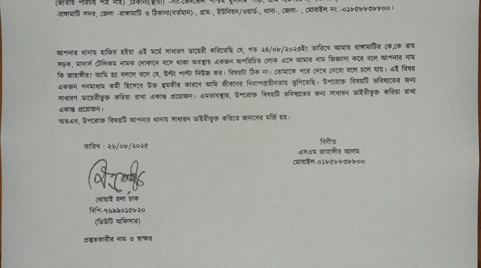 রাঙামাটি শহরের কে কে রায় সড়কে এক সংবাদকর্মীকে হুমকির ঘটনা ঘটেছে। এ নিয়ে নিরাপত্তাহীনতায় ভুগছেন বলে থানায় সাধারণ ডায়েরি করেছেন তিনি। মঙ্গলবার (২৬ আগস্ট) সন্ধ্যায় রাঙামাটি কোতোয়ালি থানায় হাজির হয়ে