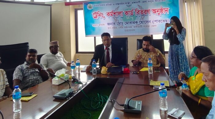 রাঙামাটিতে মানবাধিকার প্রতিষ্ঠা ও বাস্তবায়ন সংস্থার উদ্যোগে ট্রেনিং, কর্মশালা ও কার্ড বিতরণ অনুষ্ঠান অনুষ্ঠিত হয়েছে। শুক্রবার শহরের একটি মিলনায়তনে অনুষ্ঠিত এই অনুষ্ঠানে প্রধান অতিথি ছিলেন রাঙামাটি পৌর প্রশাসক ও উপ-সচিব