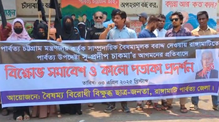 পার্বত্য চট্টগ্রাম মন্ত্রণালয়ের নজিরবিহীন বৈষম্যের কারনে রাঙামাটিতে পার্বত্য উপদেষ্টা আগমনের প্রতিবাদ জানিয়ে (৩ এপ্রিল) বৃহস্পতিবার শহরের বনরূপায় সকাল ১১.০০ টার দিকে বিক্ষোভ সমাবেশ ও কালো পতাকা প্রদর্শণ কর্মসূচি পালন করেছে